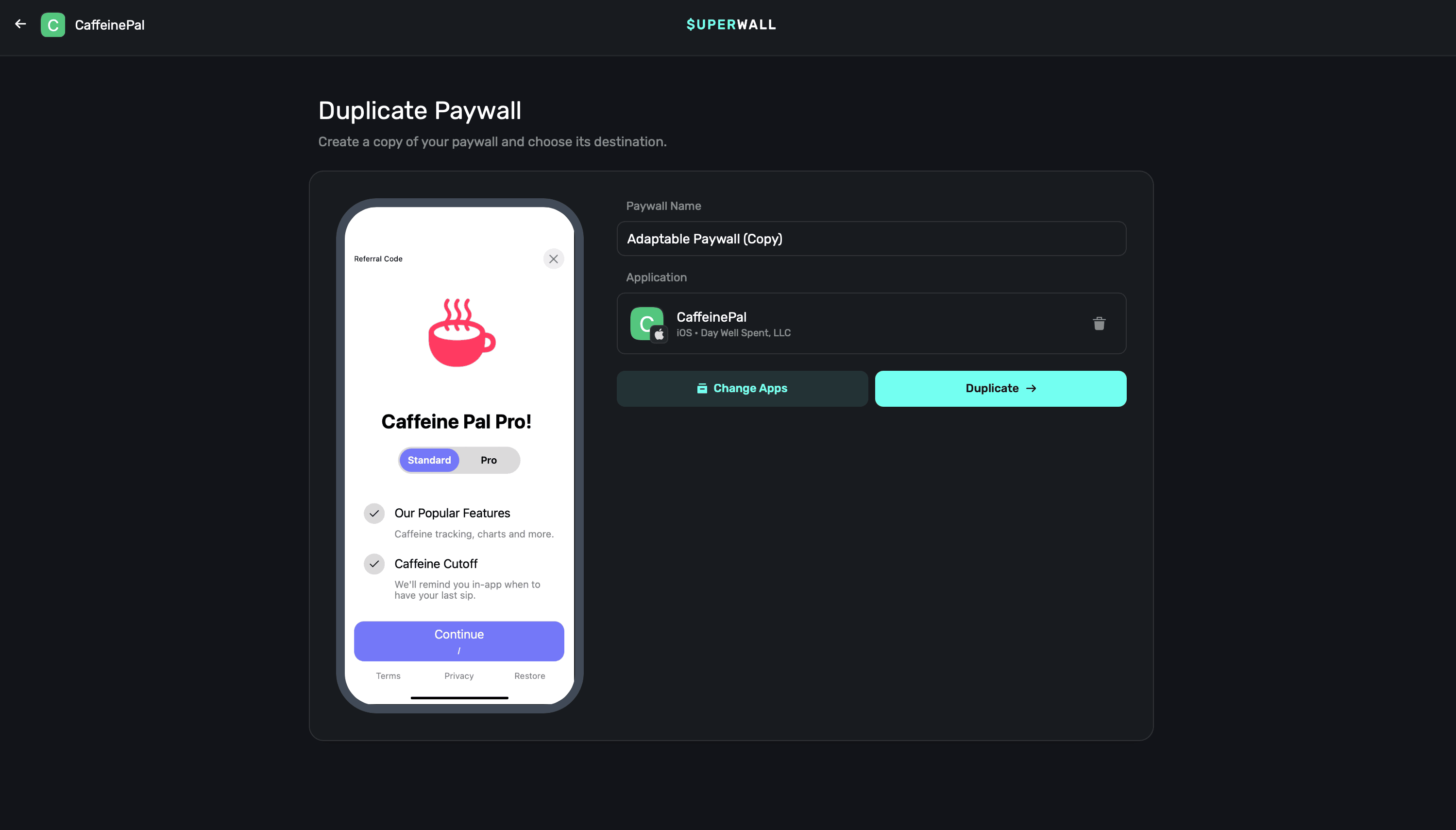 You can choose to duplicate the paywall into the current project, or into another one. If you choose to duplicate it into another project, you'll be prompted to select which app you want to duplicate it into: