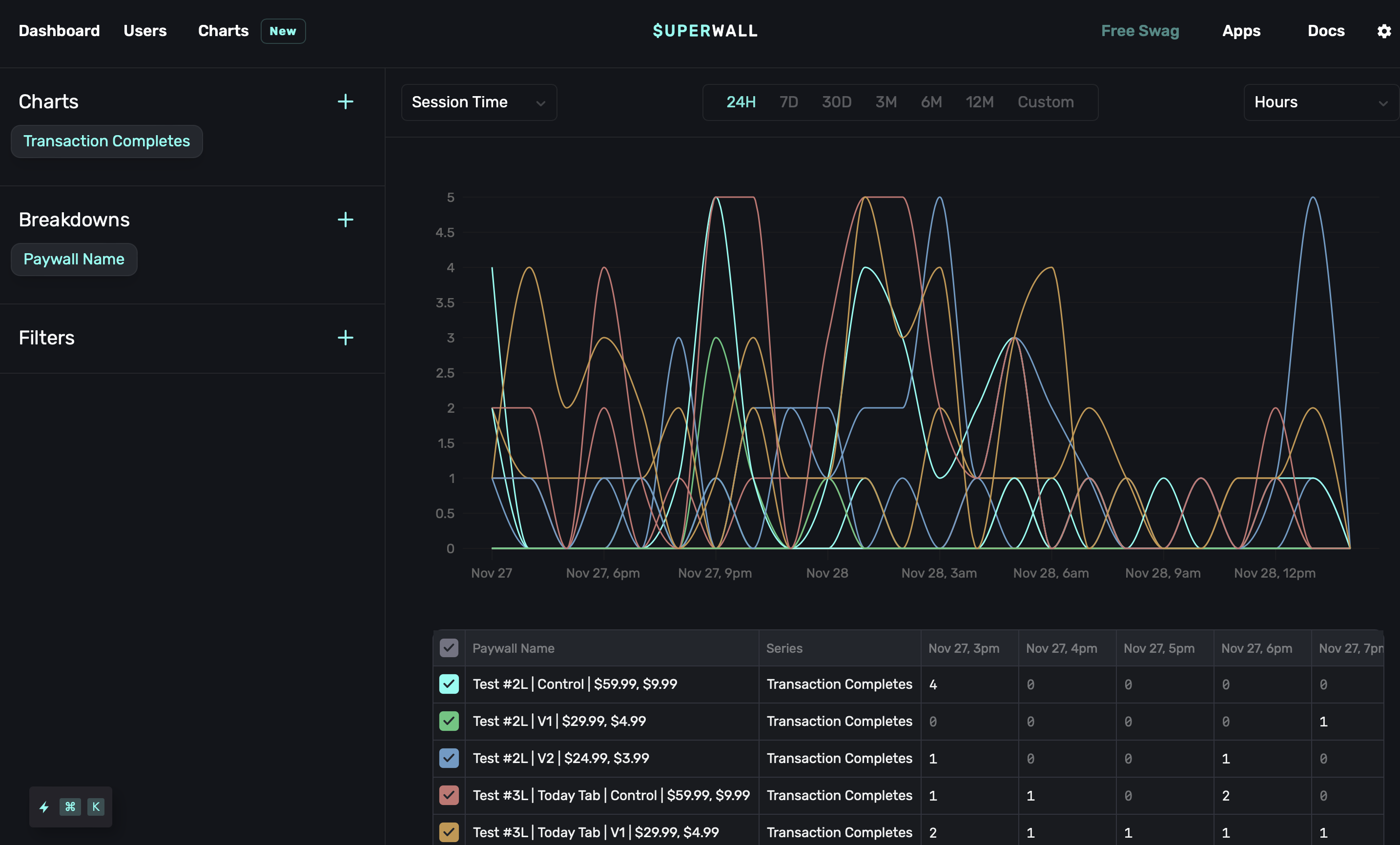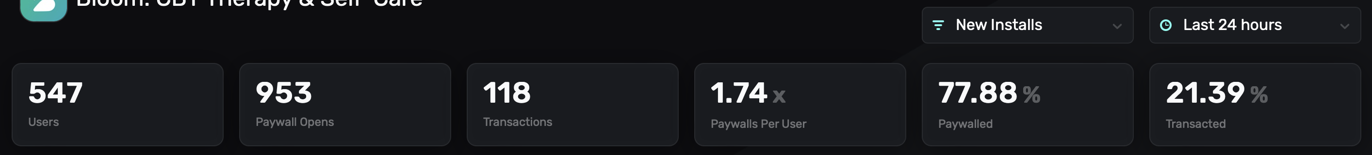 After integrating Superwall into your app, you'll notice useful analytics populate in realtime at the top of the dashboard. You can use the top right dropdown to toggle between data for New Installs and All Users, as well as refine the date range.